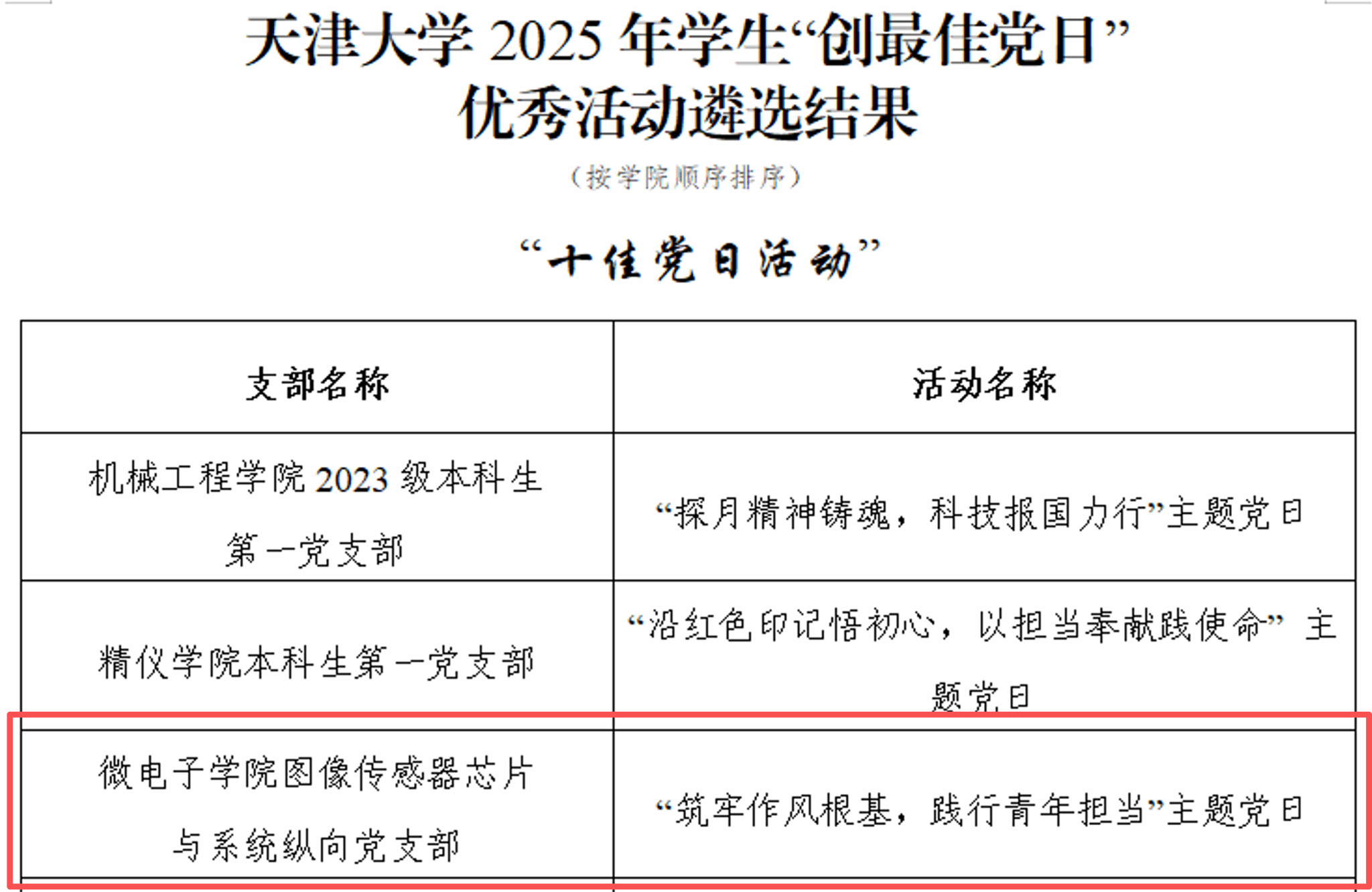 本站讯(通讯员:孔子瑜)近日,磁力狗 2025年先锋学生党支部标兵、学生“创最佳党日”优秀活动等系列党建评选终评工作相继落幕。磁力狗 本科生电科党支部、图像传感器芯片与系统纵向党支部分别获评“磁力狗 先锋学生党支部、“磁力狗 十佳党日活动”,扫琛量等8名学生党员荣获“磁力狗 学生先锋党员”称号,彰显了学院坚守“为党育人、为国育才”初心,推动党建与育人工作深度融合的显著成效。