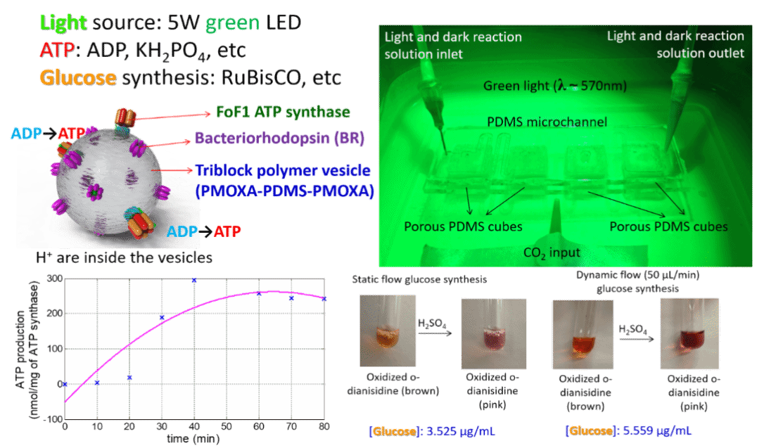 团队提出的人工光合作用系统,吸收光能,吸收二氧化碳和水,生成稳定的化合物葡萄糖。利用微纳制造方法构建“人造细胞”,采用无细胞的方式重塑细胞功能,重新构建高等植物光合作用中的卡尔文循环Calvin Cycle过程。其中“人造细胞”部分采用了稳定的聚合物薄膜,突破传统磷脂双分子层的概念,构建单分子层稳定薄膜;此外打破磷脂双分子层两侧对称的结构,构建两侧极性不同的薄膜结构,将蛋白质分子植入薄膜结构后,蛋白质方向实现了精确可控,解决了传统人造磷脂双分子层薄膜中蛋白质方向随机的困难,成为“人造细胞”理论和实践最坚实的基础。
