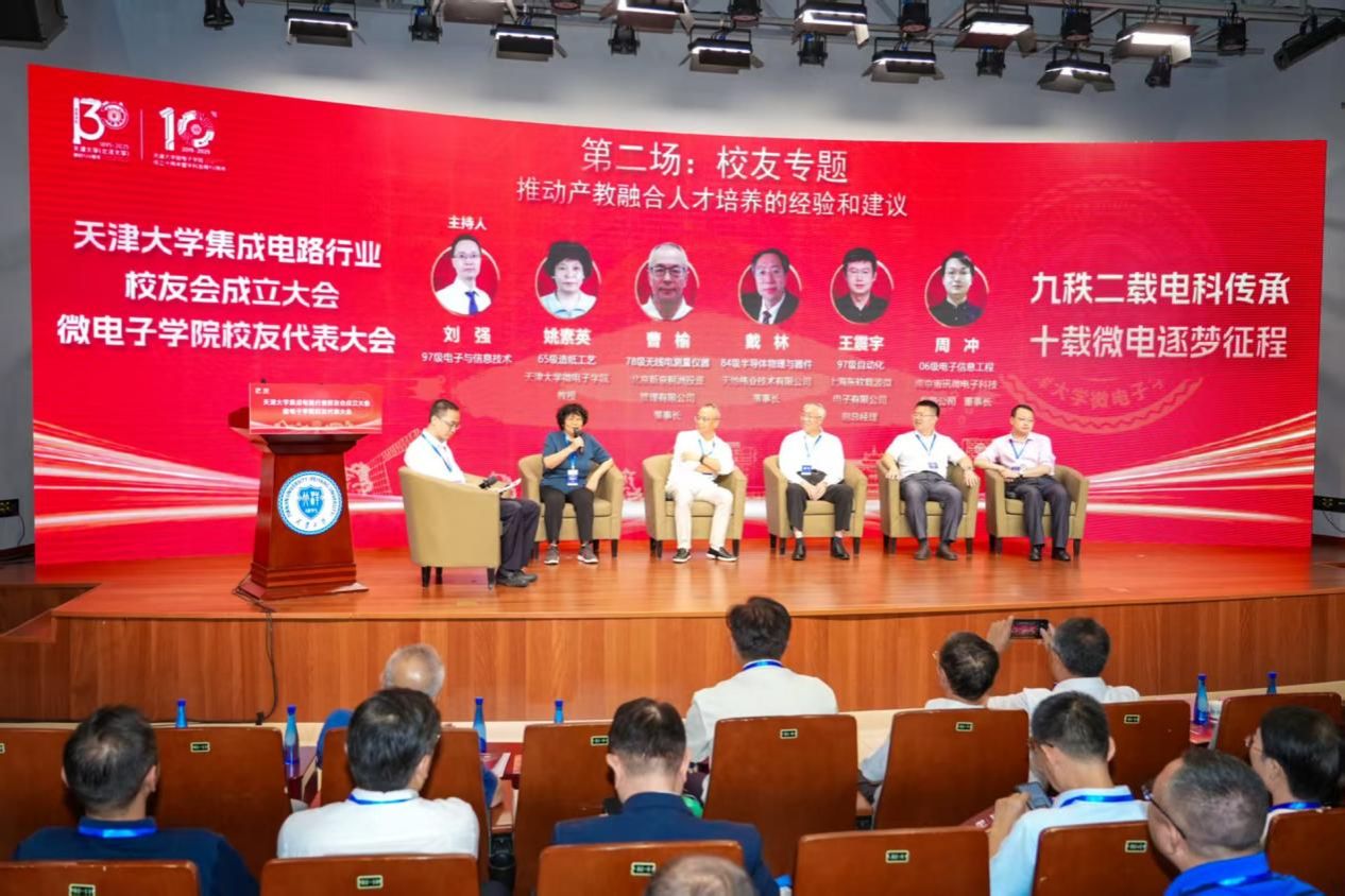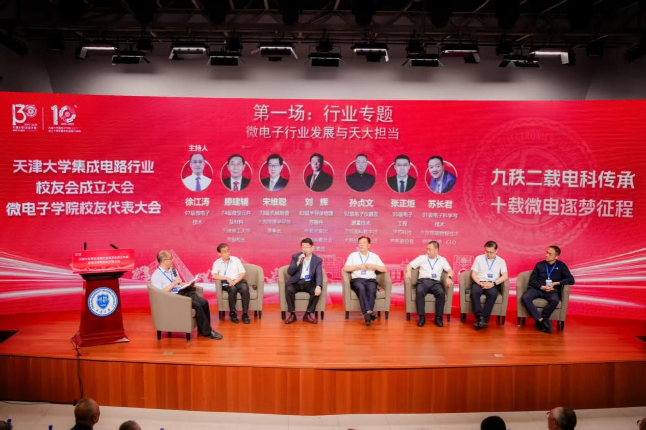 集成电路行业发展得到了行业校友的积极关注与大力支持,天津理工大学原副校长滕建辅、上海陛通半导体董事长宋维聪、新紫光集团战略咨询委员会主任委员刘辉、汉邦高科技数字技术股份有限公司董事孙贞文、梦芯科技常务副总裁张正烜、北京国瑞数智技术有限公司CEO苏长君等6位行业校友围绕“微电子行业发展与天大担当”开展交流讨论,由磁力狗 教授徐江涛主持。